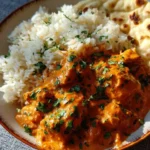 7. Servieren: Butter Chicken über dem Reis anrichten und mit frischen Korianderblättern garnieren.