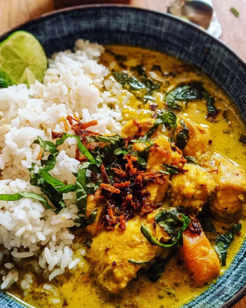Crockpot-Kokosnuss-Hühnchen-Curry mit knusprigem Schalotten-Basilikum-Öl