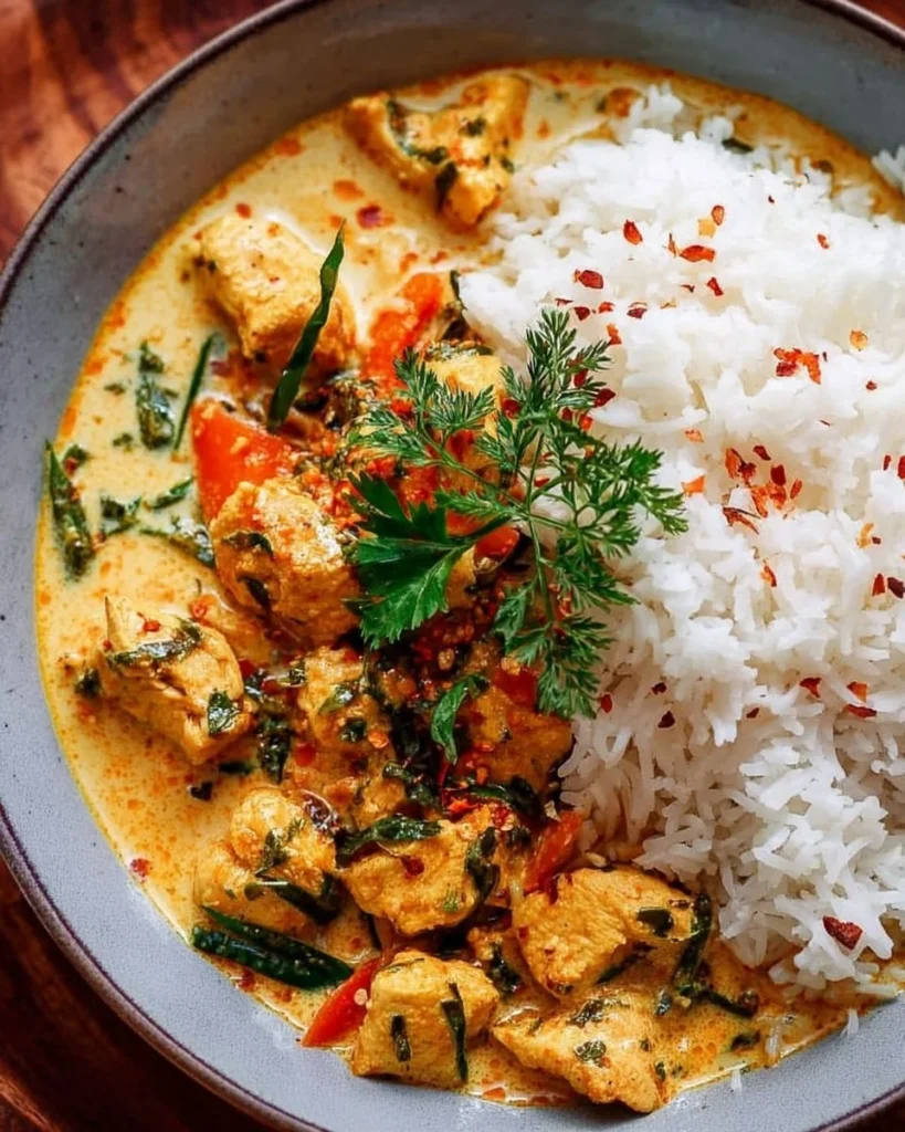 - Anrichten: Den gekochten Reis in Schalen füllen und die Kokosnuss-Hähnchen-Mischung daraufgeben. Mit frischem Gemüse und Kräutern garnieren.