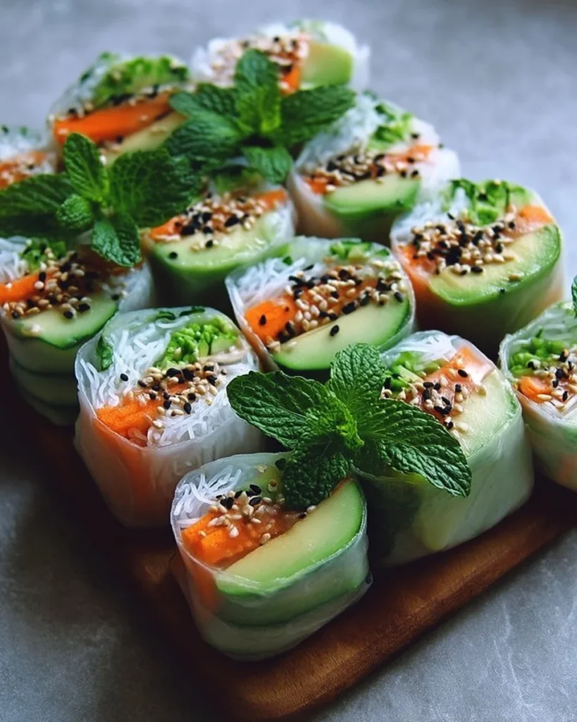 Erfrischende und knackige Sommerrollen mit Gurke, Avocado und frischen Kräutern, ideal für eine leichte Mahlzeit oder Vorspeise.