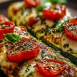 Diese gefüllten Zucchini sind eine leckere und einfache Möglichkeit, frisches Gemüse zuzubereiten und bieten mit einer köstlichen Füllung aus Tomaten und Mozzarella ein unverwechselbares Geschmackserlebnis.
