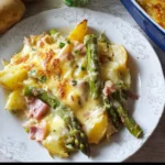 Der Spargel-Auflauf mit Kartoffeln, Schinken und Hollandaise ist das perfekte Gericht für alle, die die feinen Aromen des Frühlings genießen möchten. Dieses cremige und herzhaft belegte Gericht vereint zarte, leicht süßliche Spargelstangen mit knusprigen Kartoffeln und einer köstlichen, reichhaltigen Hollandaise. Stellen Sie sich vor, Sie versammeln Ihre Familie um den Tisch, während der Auflauf frisch aus dem Ofen kommt und sein verlockender Duft das ganze Haus erfüllt – ein wahres Festmahl! Wussten Sie, dass Spargel schon seit der Antike als Delikatesse gilt? Die Römer und Griechen schätzten ihn wegen seines feinen Geschmacks und seiner gesundheitsfördernden Eigenschaften. Wenn Sie ein schnelles, einfaches und dennoch beeindruckendes Gericht zaubern möchten, das nicht nur Ihre Liebsten erfreut, sondern auch Ihre Gäste in Staunen versetzt, dann ist dieser Auflauf genau das Richtige! Im Vergleich zu meinem beliebten Kartoffelgratin ist dieser Auflauf etwas leichter, bietet aber dennoch ein reichhaltiges Geschmackserlebnis. Also schnappen Sie sich Ihre Backform und los geht’s!